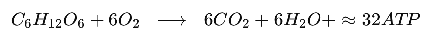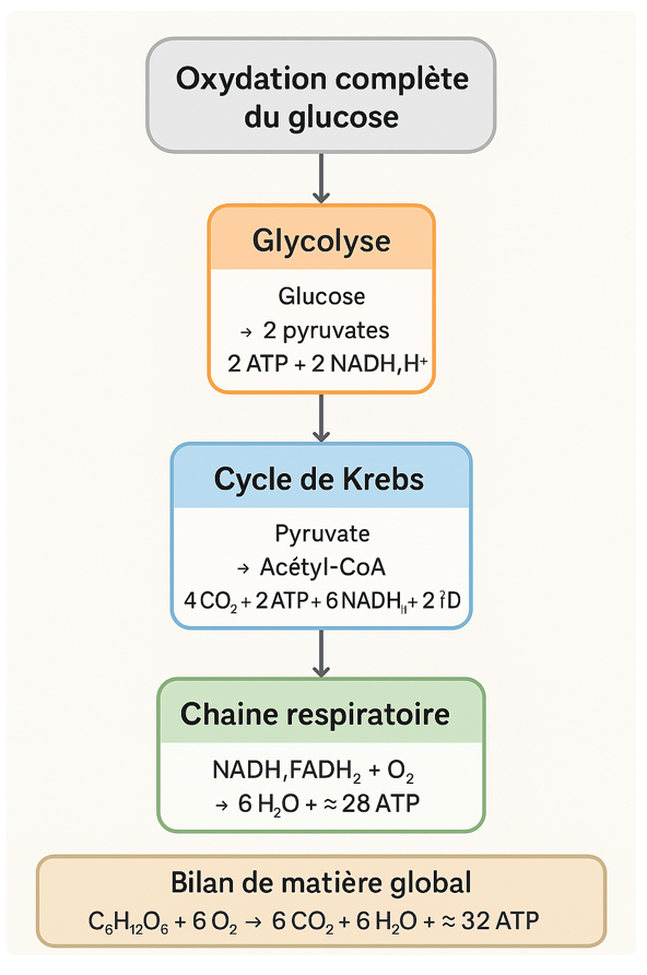 L’ensemble de ces voies aboutit à l’oxydation complète du glucose avec le bilan global : 1 glucose + 6 O₂ → 6 CO₂ + 6 H₂O + ≈ 32 ATP.